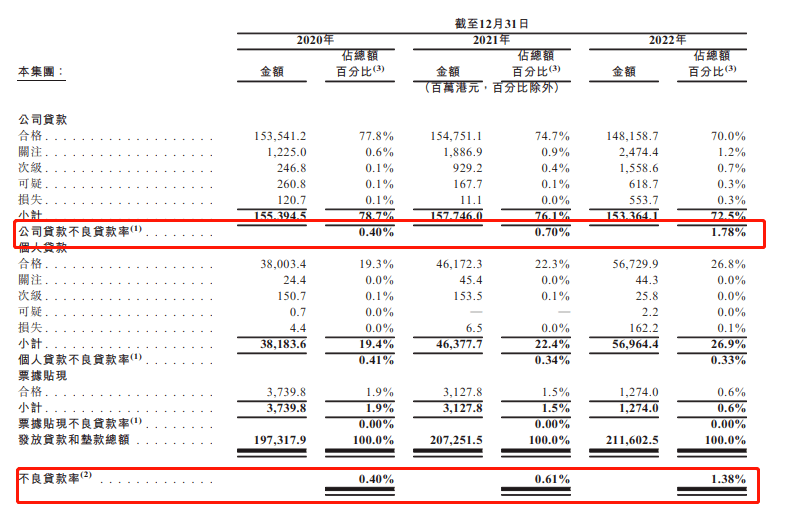 (图 / 厦门国际投资招股书(附注:「公司贷款不良贷款率」按各业务条线的不良贷款除以该业务条线的发放贷款和垫款总额计算。))
