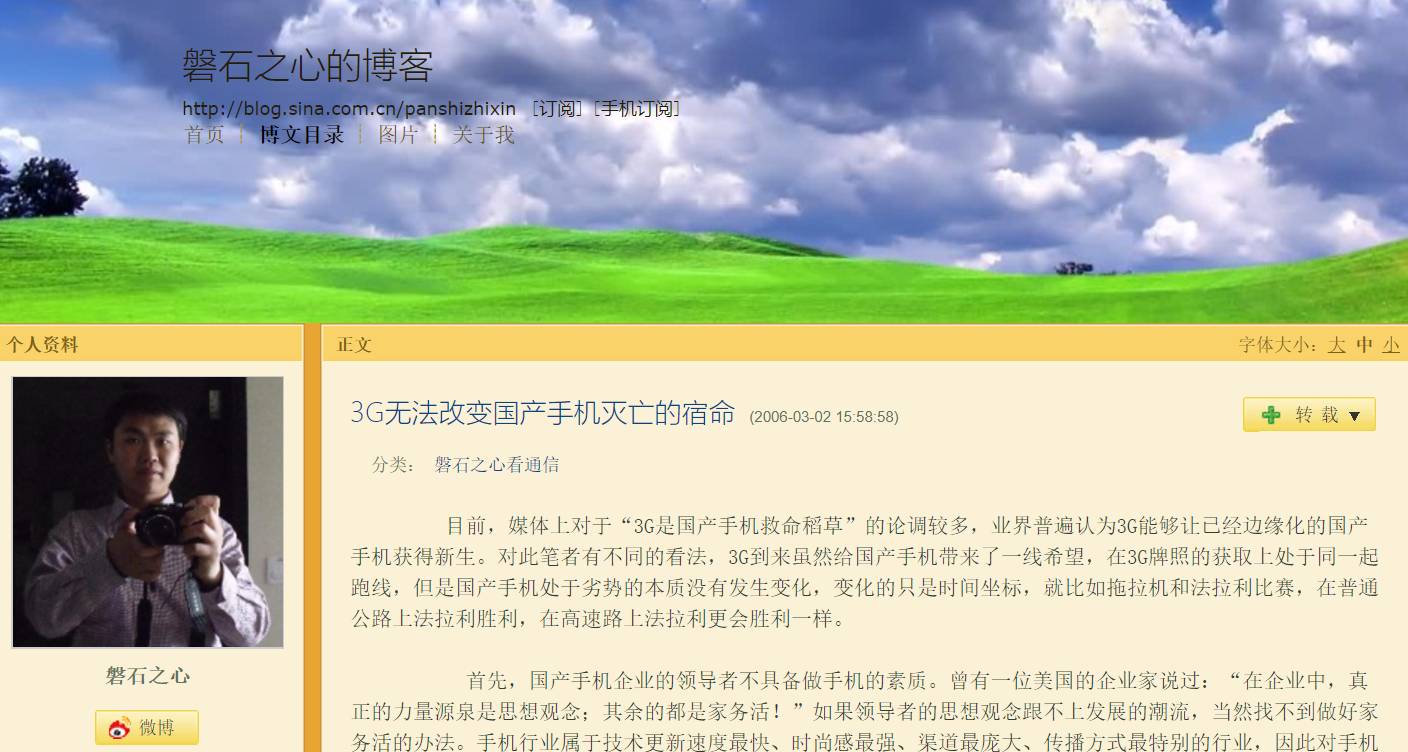 “蒲苇纫如丝,磐石无转移”这是出自《孔雀东南飞》中的诗句,自此以后,磐石就成为了坚毅、持之以恒的代名词。 磐石之心原名王斌,是国内著名的科技行业独立评论人、专栏作家、咨询顾问,这个笔名是他在开始写作时起的,并一直沿用至今。“磐石的外表坚硬,它的心也一定是坚定的”他希望用这个笔名激励自己,让自己保持初心,在自己热爱的科技写作道路上坚持下去。 01 王斌毕业于青岛大学信息管理专业,这是一门非常综合的专业,课程设置也非常广泛,包含计算机技术、经济学、管理学、物流等等,因此从这个专业毕业就会掌握很强的IT、互联网、管理学、物流等方面的基础,百度创始人李彦宏就毕业于北京大学的信息管理专业。 大学的四年学习时光让王斌积攒下了深厚的IT互联网基础,也为他后来的写作工作埋下了伏笔。 2004年,王斌大学毕业了,刚从校园走出的他就进入了海尔工作。 在海尔的工作经历让王斌受益匪浅。2004年是海尔创办20周年整的年份,也是海尔里程碑式的年份。这对当年新入职的校招员工来说,也是相当有意义。 王斌和跟他一样刚走出校园的同事们提前4个月就感受到了海尔的新员工培训,海尔公司的每一位部门领导都参与到了其中,这是海尔有史以来第一次对应届毕业生进行全方位、深入的培训。 “那一年的新员工培训持续了6个月,我非常有幸能够参与其中,海尔的文化非常好,而且对于新入职的大学生来说,这样庄重、规范的培训也是非常必要的。”虽然已经是十几年前的事情了,但每当回忆起来,王斌都非常庆幸自己能有这么一段人生经历。 培训结束后,王斌就被分配到了空调事业部,负责生产线的物流管理,这是他在海尔的第一个实习岗位,也让他熟悉了全部信息化的工作流程。 在这个岗位实习了两三个月后,王斌又被调到了采购岗位,负责空调内部铜管的采购流程的优化。“生产空调所需要的铜管型号有上百个,这导致采购下单时总弄不准库存量是多少,经常因为缺少一个铜管部件,而造成整个生产线的停工。” 王斌在进入采购部门后,接手的项目就是将空调铜管的采购误差降低到零,消除因为误差原因给生产带来的损失。 经过了一个月的时间,他在学习Excel的各种报表功能,又将自己的电脑知识融入到了这项工作中,最终做到了空调铜管管理的100%精确。 正是这个原因,让王斌被评为了海尔当月的希望之星,而且在以后的工作中,努力的他每个月都在蝉联这个殊荣。 而在工作了8个月之后,王斌最终还是选择离开了海尔,但这一段工作的经历,也成为了他后来写作生涯的铺垫。 02 从海尔离职的王斌面临了最现实的问题,本想考研的他在没有收入积蓄也用光了之后,走进了人才市场,找到了他的第二份工作。他入职了一家专门服务于海尔的咨询公司,工作内容是文案策划。 在他入职后的第一个项目就是海尔手机,他需要给海尔做出一个提案去竞标,这个任务对王斌来说难度相当大,因为他完全没接触过手机行业,觉得无从下手。 “整整一个月的时间,我每天晚上基本都加班到一两点钟,用这段时间把整个手机行业的知识先了解了一遍。学习完后我做了一个70页的PPT,亲自去海尔给他们讲解。海尔方面的负责人在听到我的简介之后很震惊,觉得我一个年轻人居然会这么了解手机行业,我也就顺利地拿下了这个项目。这个项目在执行之后,还是又我一个人负责,除了写文章之外,还要每星期做一次竞品分析和行业分析。就这样,我开始接触了写作,并且对手机行业变得十分了解。” 王斌的骨子里是一个非常爱写作的人,工作上的内容并不能满足他的写作欲望,于是在2005年,他开始以磐石之心的笔名,写一些手机方面的评论。“当时我并没有投稿的地方,所以我就在网易的评论区留言,并附上自己的邮箱。” 在评论了一个星期之后,他收到了当时网易科技主编的邮件,邮件里说磐石之心的每条评论都被顶到了评论区的第一条,所以网易科技邀请磐石之心投稿,并会付稿费作为报酬。 这虽然让王斌始料未及,但他欣然接受了这个建议,开始给网易投稿。随着名气逐渐上涨,来找他邀稿的媒体也越来越多,他就一边工作,一边写稿子赚取稿费。随着磐石之心逐渐变得有了名气,王斌决定辞职在家,专心写作。 就这样,磐石之心在科技领域内逐渐有了影响力,陆续给十几家网站、报纸杂志撰写评论文章,而且一直是自己一个人在运营。在现在看来,王斌算得上是科技领域里最早的自媒体了。 03 2006年对王斌来说是相当重要的一年,新浪博客在这一年开始运营,磐石之心成为了第一批入驻博客的科技类作者。同样是在2006年,磐石之心开始与腾讯合作,为腾讯无线的相关产品撰写介绍文章,这也是他第一个以个人名义合作的巨头企业。 (磐石之心的第一篇博客文章) “当年门户博客的流量太大了,2006年3月份我发布了第一篇博客,之后我的每篇文章都有很高的阅读量,而且都被推到了博客的首页。至此之后磐石之心打出了名气,后来很多企业逐渐开始邀请我参加发布会,写文章也是我当时唯一的收入来源。” 磐石之心就这样一个人专心写作,一直写了五年。 除了写博客之外,磐石之心还在这五年期间写了一本书——《融合之道》。 “这本书是我2010年写的,当时正是移动互联网刚刚发迹的时代,我在这本书里预言,下一个时代是属于传统产业与互联网融合的时代,