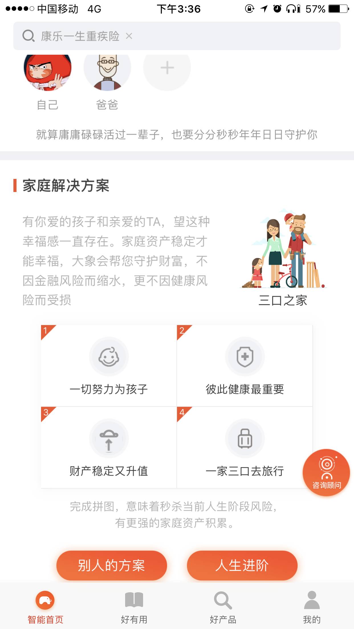 在“大象保险”3.0版本中,最大的亮点就是加入了家庭解决方案这个功能。