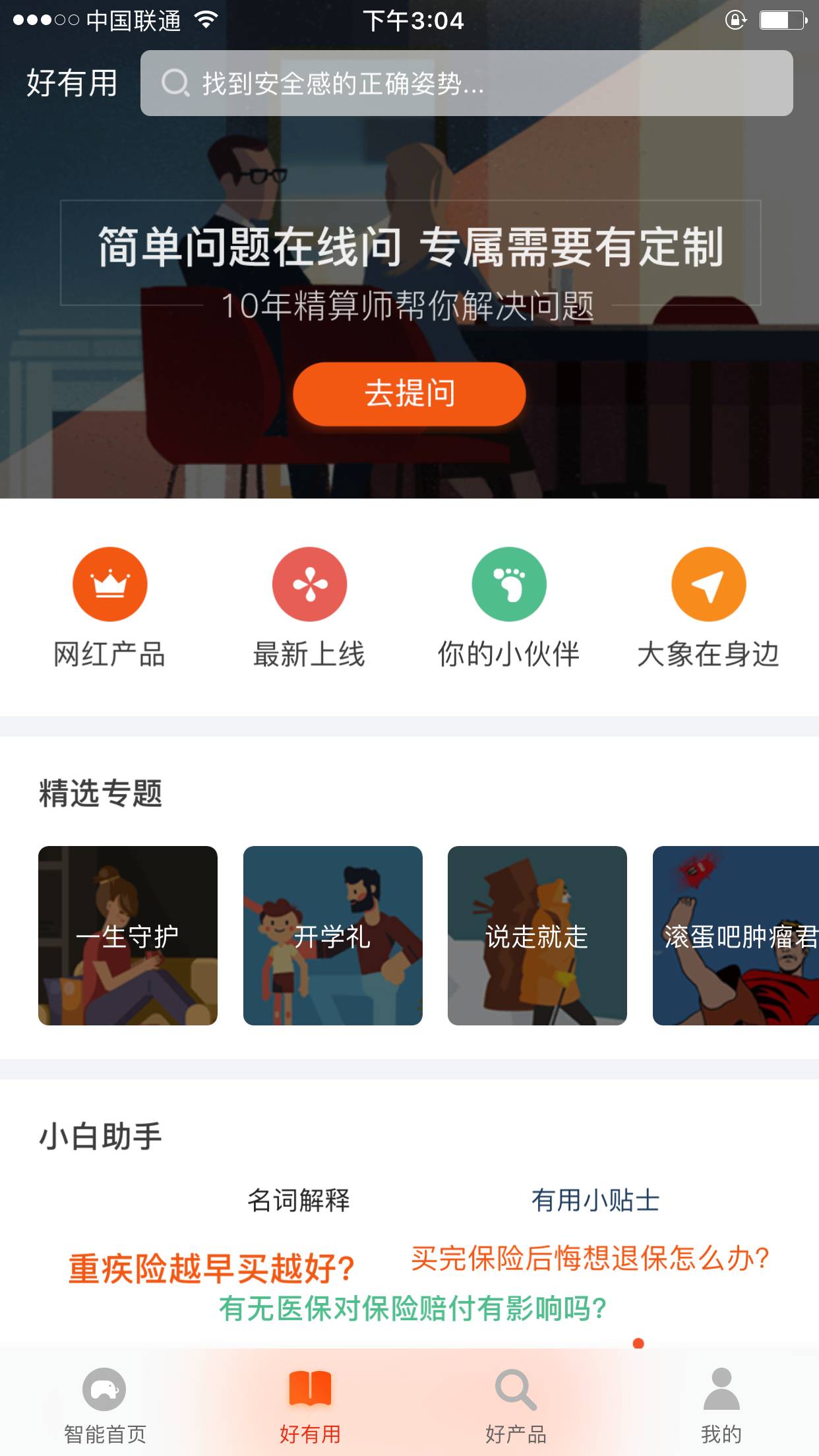 “大象保险”3.0的“好有用”版块就是一个极为靠谱的保险诉求解答解答平台。“好有用”设置有在线问答、资讯研究、大V观点等多部分内容,可同时满足小白用户、初级用户、高级用户对保险的内容诉求。