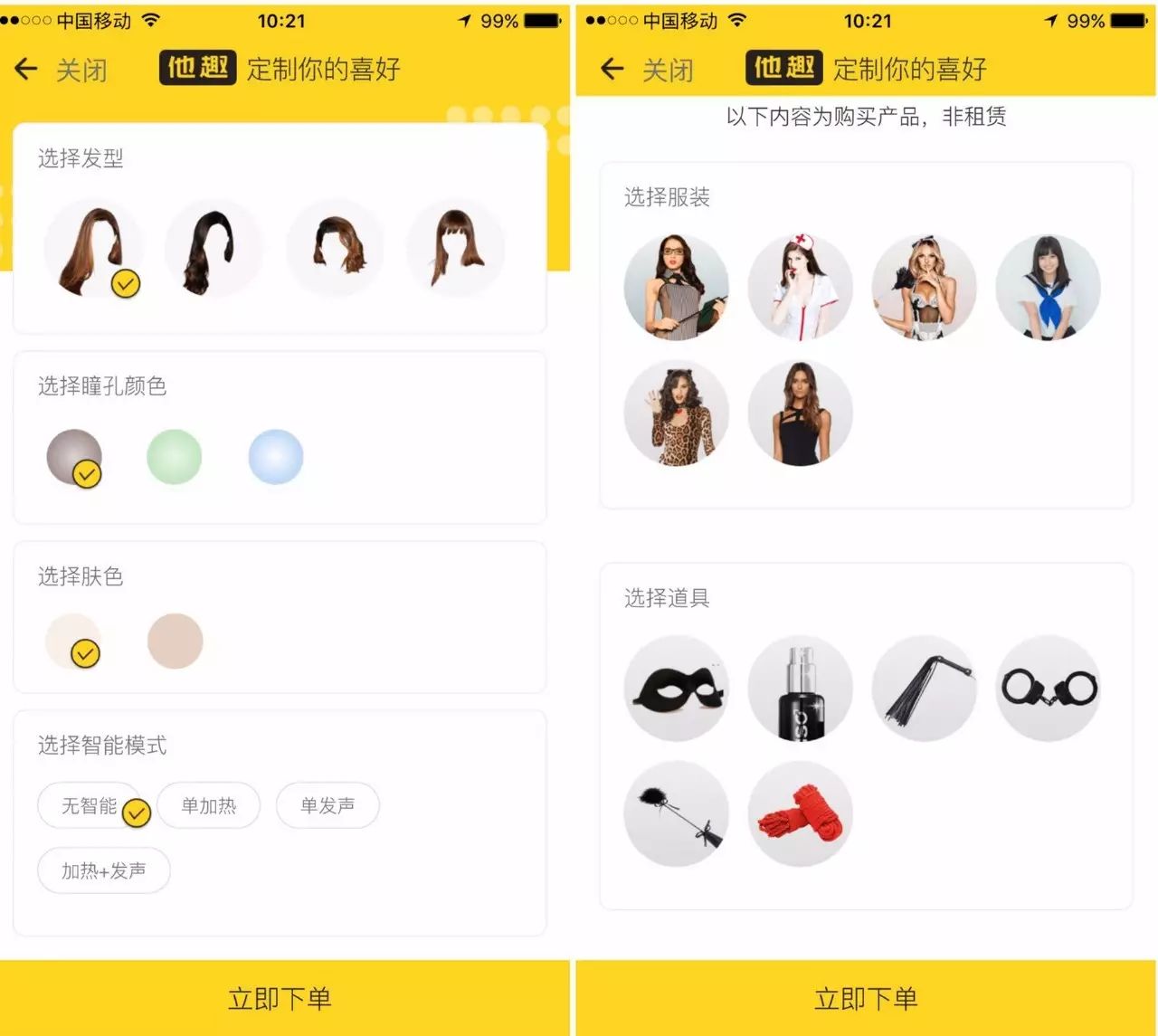 无论是喜欢欧美狂野型的御姐,还是偏爱貌美肤白的萌妹,都可以通过个性化定制服务来搭配:发型、瞳色、肤色,甚至能添加发声、加热、服装和道具等功能......