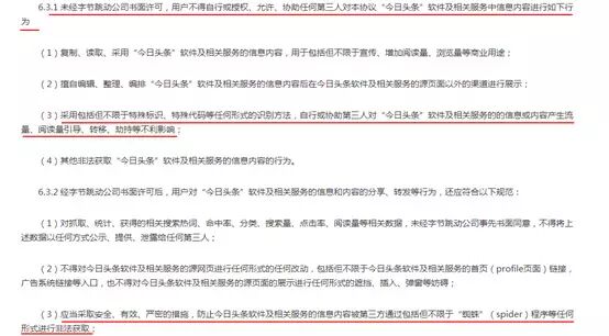 今日头条用户协议规定,用户“应当采取安全、有效、严密的措施,防止今日头条软件及相关服务的信息内容被第三方通过包括但不限于‘蜘蛛’(spider)程序等任何形式进行非法获取”。