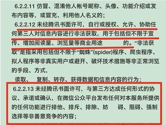 比如微信公众平台协议禁止“未经腾讯书面许可,自行或授权任何第三人对信息内容进行非法获取。”
