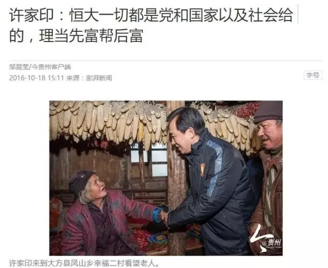 2015年11月6日至8日,在全国政协十二届常委会第十三次会议上,许家印提出“恒大的一切都是党给的、国家给的、社会给的,恒大理当担起先富帮后富的社会责任。”比郭广昌、刘强东、王健林觉悟早了近两年。