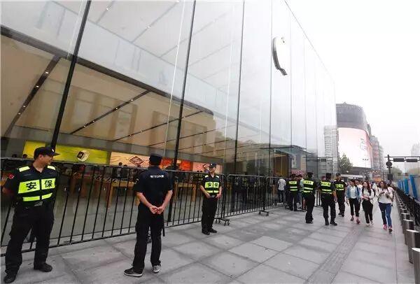 8:05,记者来到平海路的苹果旗舰店,远远就看见门口黑压压的一片,很多很多保安,还单独安排了两人站岗……那气势真是没话说。