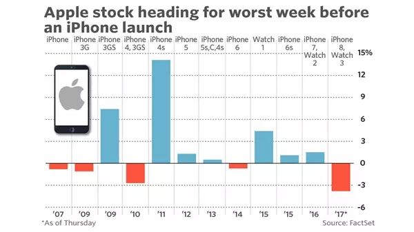 据MarketWatch报道,iPhone 8发布之后,苹果股价持续走低。在周三下跌1.68%之后,周四继再跌1.7%。