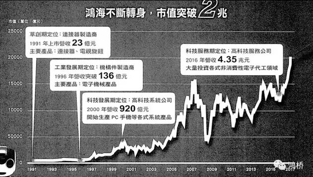 2000年,鸿海再次重新定义自己,“要做科技的鸿海”,从机械公司变成系统公司,鸿海开始攻下PC、手机的世界冠军。鸿海营收冲上三兆元高峰。