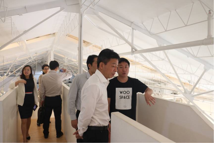 在无界空间创始人万柳朔的带领下,邵立春等领导一行人参观了无界空间?大悦城店,实地感受了联合办公空间中环境设计以及新时代下创新创业者们的工作状态。