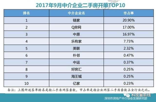 据券商中国(微信ID:quanshangcn),虽然房地产中介协会没有公布租赁市场的具体市场份额,但从深圳市房地产中介协会公布的二手房成交的信息来看,9月份,中介企业二手房开单排名显示,前三位依次是:链家市占率20.9%,Q房网市占率17%,中原市占率6.97%。