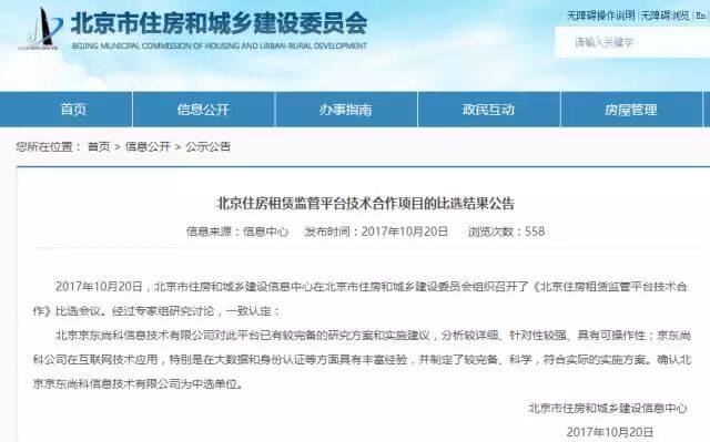 近日,北京市住建委网站的“北京住房租赁监管平台技术合作项目的比选结果公告”,北京京东尚科信息技术有限公司为中选单位。这意味着,京东将成为北京住房租赁市场的支持平台,拿到了进军住宅租赁市场的入场券。