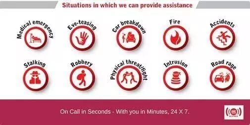 注册用户只需点击SOS按钮,即可链接全印度800多个城市的24h X 7指挥控制中心,同时向位于最近的即时协助小组发送一个位置坐标警报。并自动联系受害者的家人,如有必要还将与救护服务,医疗服务,消防安全,汽车维修等机构进行协调。