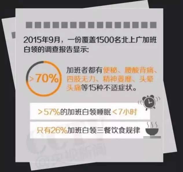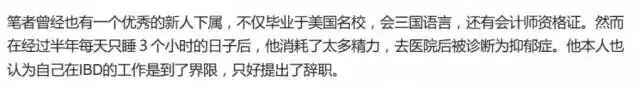 “有一个老板叫大卫,下午六点出现,眼神恰似黑背,手里端着一壶热腾腾的咖啡,嘿嘿嘿我们要不要来开个会……求你不要说出那句话,宝贝加班吧,感觉身体被掏空,我累得像只狗。”——《感觉身体被掏空》歌词 这唱出了当前许多上班族的心声:过度劳累,透支健康。 央视财经2016年曾报道,有资料显示,巨大的工作压力导致我国每年“过劳死”的人数达60万人,已超越日本成为“过劳死”第一大国。 图片来源:央视新闻 “过劳死”的威胁对象已从体力劳动者转向脑力劳动者,且呈年轻化趋势。而这已不是哪个行业独有的现象,广告、媒体、医疗以及金融等行业都没有幸免。 图片来源:央视新闻 而如今又到了Q4,各位金融民工开始搬砖拼业绩等年终奖的时候,一位28岁北漂投行女的讣告文又在刷屏。 每次这种文章出来,朋友圈里一帮金融民工嗷嗷喊着要珍惜生命和健康,早点下班。但是下次遇到这帮人,主题还是加班和加薪。 最多也就是当天听到“XX金融员工因过度操劳不幸去世”的消息的时候,当天8点前下班,正好和9点入睡的儿子打个照面,享受下儿子叫“叔叔”的生活。第二天就扔到了脑后,加班到凌晨回家。 什么时候,职场人心中的跳板、实现自我的地方,不知不觉成了埋葬理想、甚至埋葬自身的地方? 拿命换钱的年轻人太多了…… 努力≠拼命,如果所有的人都默默忍受,当所有人都埋头加班,这样的生病、猝死事件恐怕只会越来越多。 有的时候也会对于这样忙到没有性生活的人生表示怀疑:工作的意义是什么?做一颗资本洪流裹挟中的螺丝钉? 这是最好的年代,也是最坏的年代 金融圈可能是一众莘莘学子最期待进入的一个圈子。打交道的都是企业高层,经手的都是几千万上亿的大生意,只有最聪明和最有野心的一群人可以在搏杀中进入金字塔的顶端。 比如说投行。想进投行,至少必须是硕士学历,清华、北大、人大这类国内一流名校进去都是最普通的。如果没有背景和人脉,那基本上都是要从实习干起。 而且,也不止是投行,金融圈里干得好的,走上人生巅峰,迎娶白富美也不是不可能。比如中信资管的聂磊,人大01国经贸专业毕业的大帅哥。 还有,比如在摩根斯丹利工作过的刘海峰,现在在做私募,迎娶的就是“万人迷”陈好。这样的例子不胜枚举。 不过,这个世界是公平的。跟金融圈高薪和光鲜的外表所并存的,还有行业人员几乎普遍存在的亚健康和失眠,过劳,压力大,甚至是抑郁症。 国信证券曾经的明星保代郭熙敏,在周六周日连续两天加班后,突发心肌梗塞,年仅33岁猝死,留下了才出生一年的幼子和悲痛的亲人。 26岁年轻医生加班后猝死,两个月前他曾写下:下班啦,还活着真好…… 《亲历投行》的作者班妮,就曾经写过连续72小时不合眼加班,8天路演,飞行12000英里,穿越7个国家8个时区,华尔街精英的受虐程度都超越常人。 都知道身体是革命的本钱,是生命中一切得到的最前面的那个1,如果没有1,后面无论有多少0都是枉然。在“财富”和“健康”中,金融民工如何平衡“鱼”和“熊掌”?是每个身在其中的人都该认真思考的问题。 停不下的过劳,和爬不上的高薪 有个好基友,在一家投行待了5年后离开了,作为一个职场妈妈,越往上升,压力越大,平衡工作和生活几乎成为哥德巴赫的猜想,可能存在,但是无法证明。 据她所说,一年平均下来一周差不多80个小时,但是需要的时候,连轴转三天也是很常见的事,待在这行,只能坚持熬。有次看见刘涛说和她老公一年加在一起呆了15天,她说想了想,自己的生活都快赶上明星了。 更多时候,金融民工往往要到了已经病了,才发觉健康的可贵。在知乎上有人分享了他们身边的故事。 在那篇刷屏的讣告文中有一句话,“不要用自己的生命,去点亮他人罩在你头上的光环”。 即使是以高薪著称的券商,年薪百万,也只是当了投行董事总经理之后的薪水,从助理到分析师大概要三年。普通刚入行的人,大概也就在15-40万之间,在国内算不错,但薪水波动幅度很大。而分析师的收入基本上是要靠拼命干活儿赚出来的,做调研、准备材料、改PPT、写Memo、打文件、做pitchbook。 努力工作≠ 拼命 对于职场人来说,就业、升职、加薪、买房、户口、结婚、子女教育.......一年365天,几乎天天都在焦虑。 尤其是这个互联网高速发展,智能领域不断进步的时代,很多传统工作不断被人工智能所代替,机器人做账、机器人写稿、机器人物流、机器人送餐....... 为了生活,为了工作,为了将来,我们焦虑将会被这个残酷的社会抛弃。 闺蜜发来了一篇《女人不努力工作,将来可是要结婚的》的文章,老板又分享了一篇《你现在不拼命工作,将来被淘汰的就是你》,说年轻人要好好工作,好好努力,否则以后就失业了。 所有人都告诉我要努力,似乎,全世界都在努力工作,全世界都比你努力。 于是,为了活得更好,你只能更加努力,甚至是拼命。 于是,在他们身体最好的年龄里,他们肆意的挥霍,肆意的透支。 不要轻易说拼命,拼着拼着,命可能真会没了。 人的一生, 有太多事都是做不完的,有太多的梦想,都是不能实现的。如果你因为拼命而猝死,不幸离开了人世,你之前所有的努力,都是浮云,都是水中月镜中花。 等你离开了,最受伤的还是你的家人,爱你的人。 你为之而拼命的工作,老板在叹息几秒之后,立马找了新的员工来接替,你为之而拼命的梦想,终将一场空;你为之而
