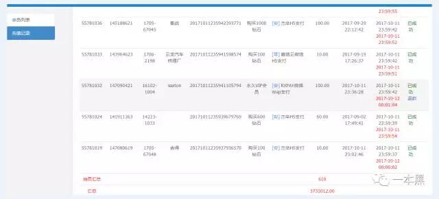 从充值记录中可以看出,有购买钻石充值的,也有充值VIP的,一天的数据流水就高达370多万。