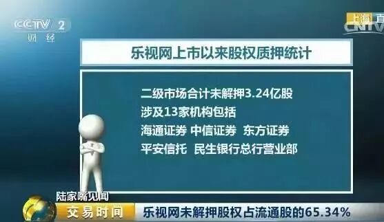 除此之外,涉及乐视网二级市场股权质押的机构,合计未解质押数量一共3.24亿股,包括11家券商,分别是海通证券、中信证券、东方证券等;1家信托,即平安信托,还有1家银行,民生银行总行营业部。