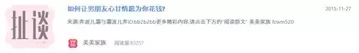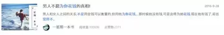 前几天,我在网上随便搜了搜,就有了《女人一定要舍得为自己花钱》《男人不愿为你花钱的真相!》《如何让男朋友心甘情愿为你花钱》《娶老婆,一定娶会花钱的那种》《聪明的女人,舍得为自己花钱》……而这些文章,90%以上都是10W+。