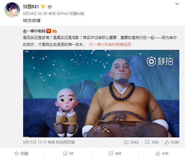 她的最新一条微博里,一禅小和尚问和尚“师父,我昨晚做了一个好美的梦,你说梦会不会是真的”。