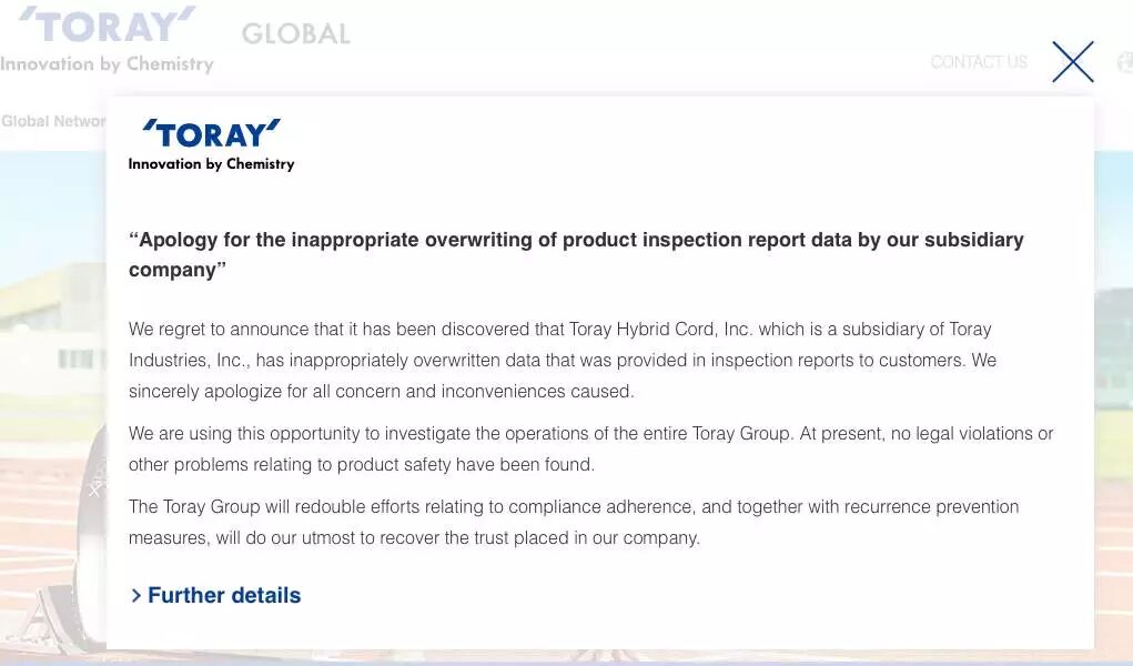 今天打开东丽的官网,就弹出来这个道歉框,可以看出事态的严重性。东丽工业承认自己旗下生产轮胎增强纤维的子公司Toray Hybrid Cord存在数据造假行为。内部调查发现,从2008年到2016年的八年期间公司发生了149起造假行为,系员工不当的处理了测试数据。