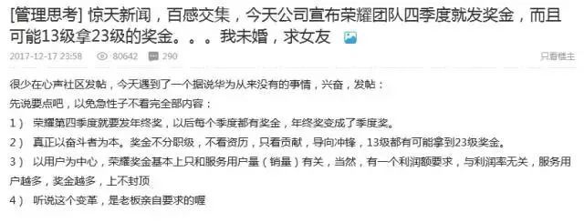 在华为论坛心声社区中,有荣耀员工发帖爆料因公司2017年业绩突飞猛进而提前发布奖金的相关消息。顺带还为自己相了个亲。看其发布时间正是几天前。