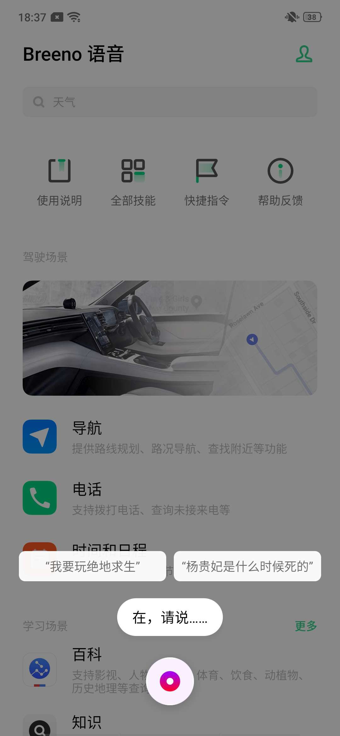Breeno拥有语音、识物、识屏、速览、空间、建议、驾驶7大模块。