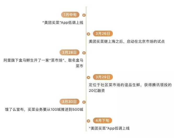 美团买菜、盒马菜市、谊品生鲜(腾讯领投20亿)、饿了么买菜、苏宁菜场相继上线,背后是阿里、腾讯、美团、京东、苏宁等巨头纷纷入局。