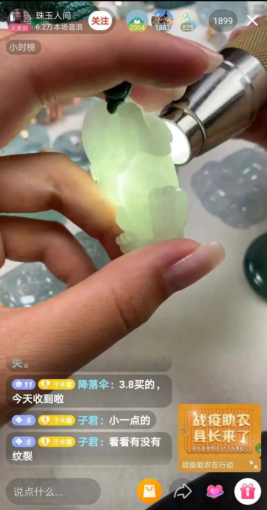 如今,于丰也在从事大件玉雕创作之外,也开始关注小型玉石饰品销售市场。2019年12月,于丰也开通了抖音号“珠玉人间”,主打翡翠精品,并通过保真的高品质翡翠作品吸引了一批喜爱玉石的粉丝。截至目前,该账号共发布82个短视频,关注人数达到20万。