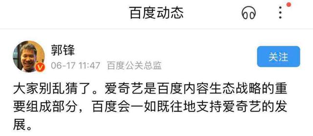 6月17日,在百度App上实名认证为“百度公关总监”的郭锋做出回应称:“大家别乱猜了。爱奇艺是百度内容生态战略的重要组成部分,百度会一如既往地支持爱奇艺的发展。”