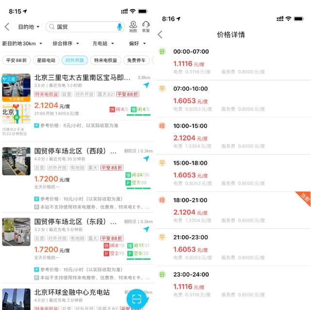 「创业最前线」在特来电APP上看到,晚上8点多,北京市内充电桩收费大致在每度电1-2.5元左右,这其中,包括基础电费以及0.8元/度服务费,并按不同时段灵活计费。