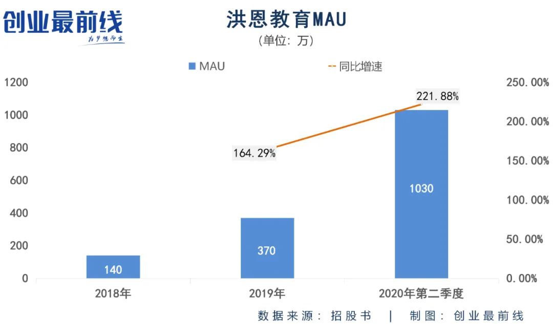 公开信息显示,洪恩识字于2018年第二季度开始商业化,这一年该公司线上APP产品的MAU(月活跃用户人数)为140万;到了2019年,这一数字飙升至370万,增长1.64倍;今年第二季度,洪恩教育线上APP产品的MAU更是高达1030万,是去年同期的3倍之多。