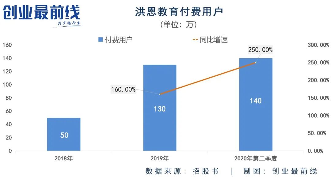 伴随MAU提升的同时,洪恩教育的付费用户数也迎来高增长。2019年,该公司的付费用户数为130万,较2018年同期的50万增长1.6倍;今年第二季度,洪恩教育的付费用户数达到了140万,接近去年同期的4倍,超过2019年全年水平。