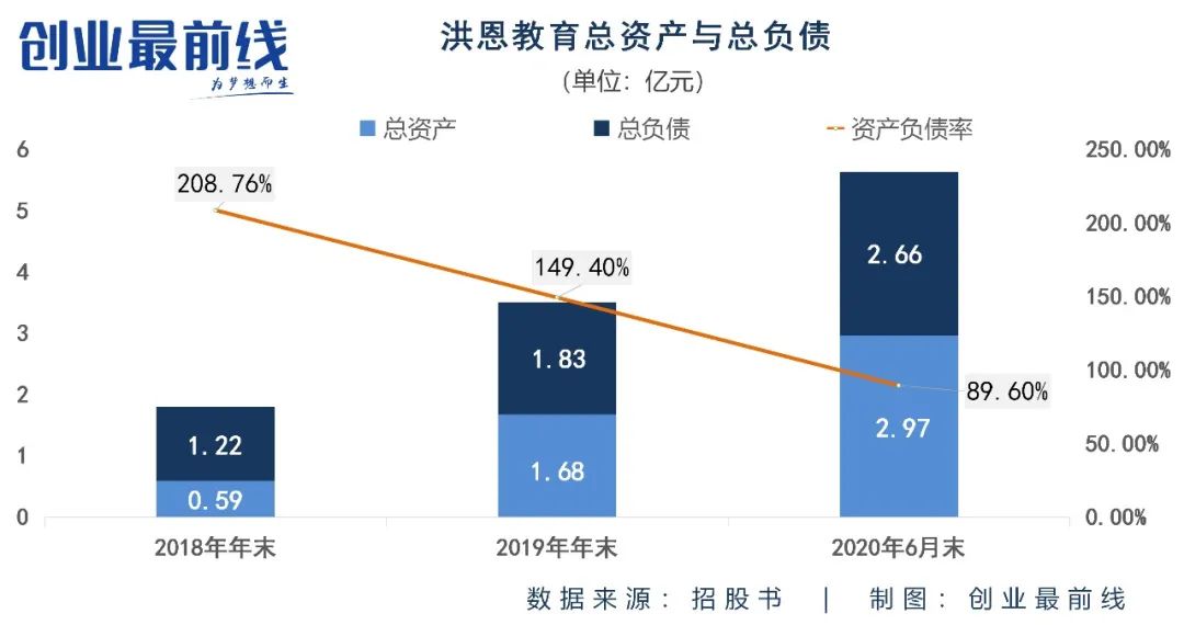 根据招股书,截至2018年年末,洪恩教育总资产为5859.9万元,总负债达到1.22亿元,资产负债率高达208.76%;到了2019年年末,该公司的总资产虽达到1.68亿元,但总负债也增长至1.83亿元,资产负债率达149.40%;截至今年6月末,洪恩教育总资产为2.97亿元,超过了2.66亿元的总负债,但资产负债率仍高达89.60%。