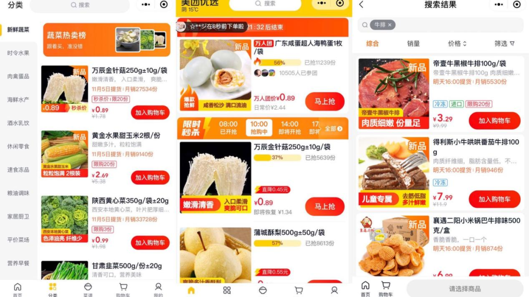 以西安为例,打开所在地美团优选首页,商品流中几乎都是价格1元左右的团购秒杀活动;在商品分类栏,几元钱的低价商品占据绝大多数,其中不乏牛排等肉类产品。