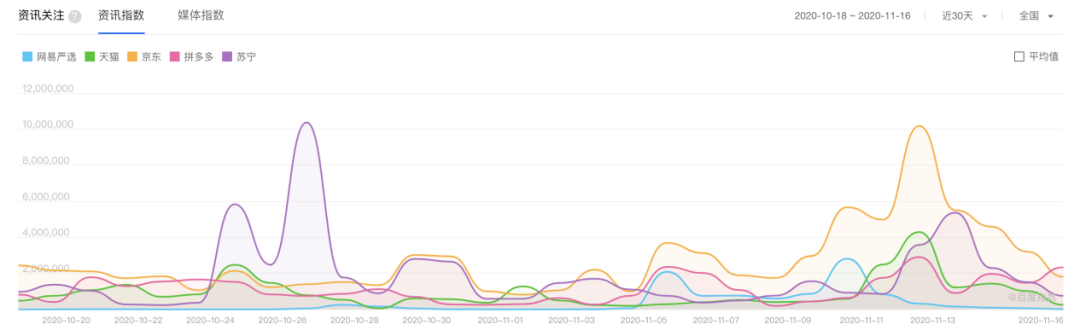 百度指数数据显示,从10月18日-11月16日,在天猫、京东和拼多多等几家电商平台中,严选的资讯指数落于下风,仅在11月5日和双11当天出现过波峰。