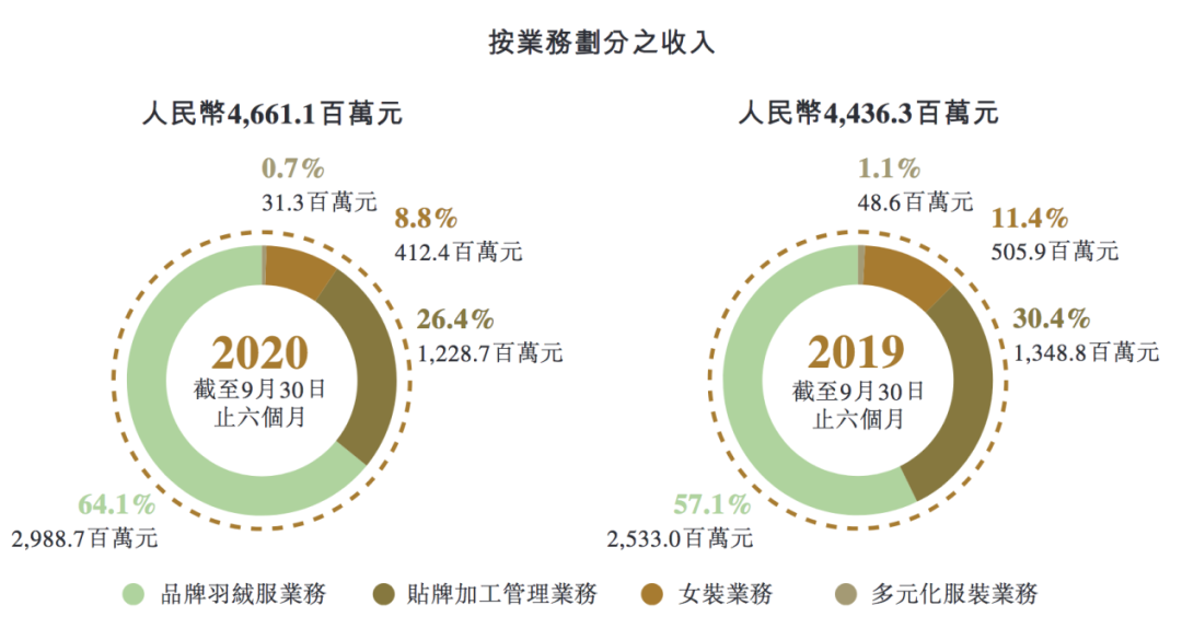波司登2020财年中期财报显示,品牌羽绒服业务中,最大收入来源即为波司登品牌,截至2020年9月30日止6个月,该品牌收入同比上升19.7%,达到27.26亿元。