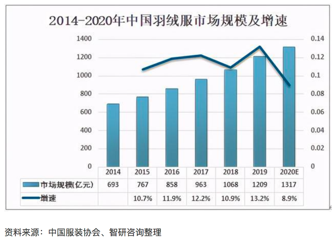 智研咨询报告显示,预计2020年中国羽绒服市场规模为1317亿元,同比增长8.9%,增速低于往年。