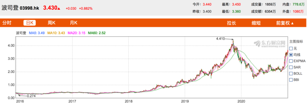 前几年波司登深陷危机之时,其股价一度跌至1港元以下。2018年宣告转型后,其股价开始提升。2019年11月,波司登股价曾涨到4.41港元,为近几年的高位,但到了2020年夏秋季节,其股价即跌至2港元左右,到了10月又再度上扬。