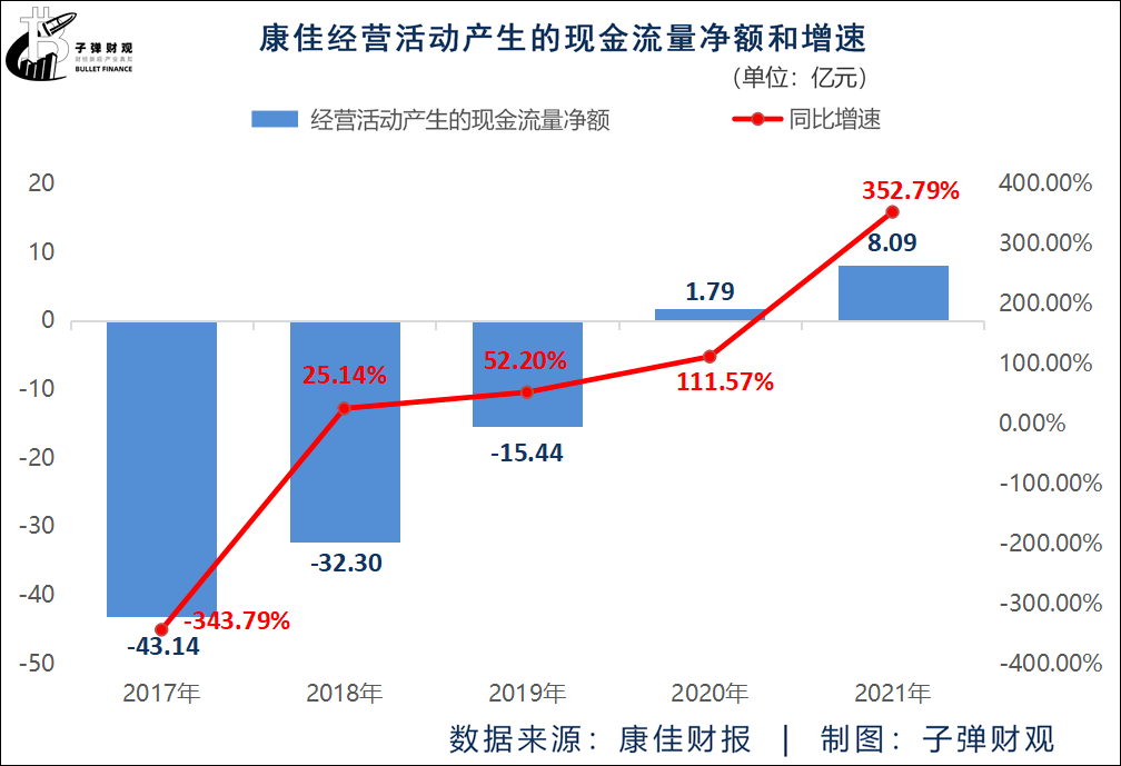 康佳的经营活动产生的现金流量净额增速也在不断加快,从2017年的-343.79%升至2021年的352.79%,年平均增速近40%,达到39.58%。