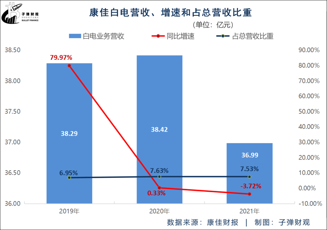 第二,康佳的白电业务营收增速逐年递减。据康佳此前披露的财报显示,最近3个年度,该公司的白电业务营收增速依次为79.97%、0.33%和-3.72%。