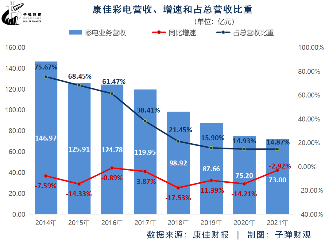 第一,康佳的彩电业务营收连年下滑。根据康佳往期财报,在过去的8个年度里,该公司的彩电业务营收已由2014年的146.97亿元降至2021年的73亿元。