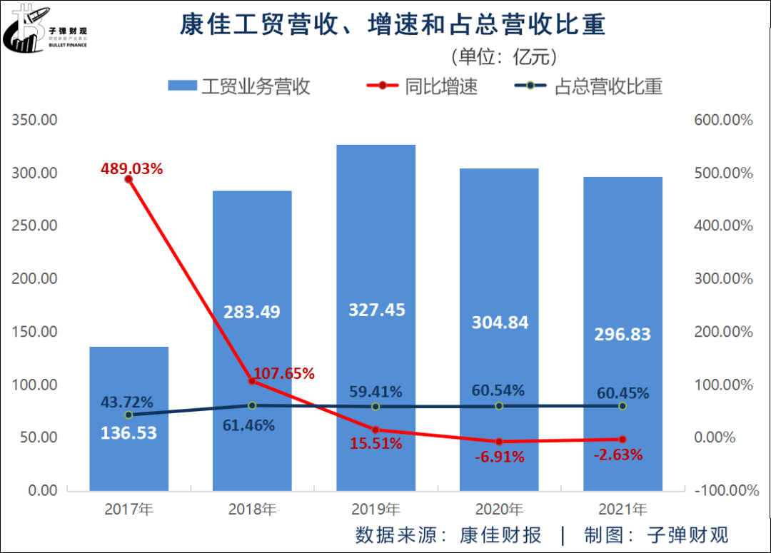根据财报,在过去的5个年度里,康佳的工贸业务营收增速已由2017年的489.03%暴跌至2021年的-2.63%,降幅高达491.66%。
