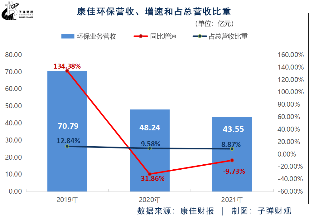 而且,康佳的环保业务营收增速在2019年达到最高,为134.38%,此后的两年均为负值,分别为-31.86%和-9.73%;加上康佳的环保业务为其贡献的营收比重逐年减少,从2019年的12.84%降至2021年的8.87%。