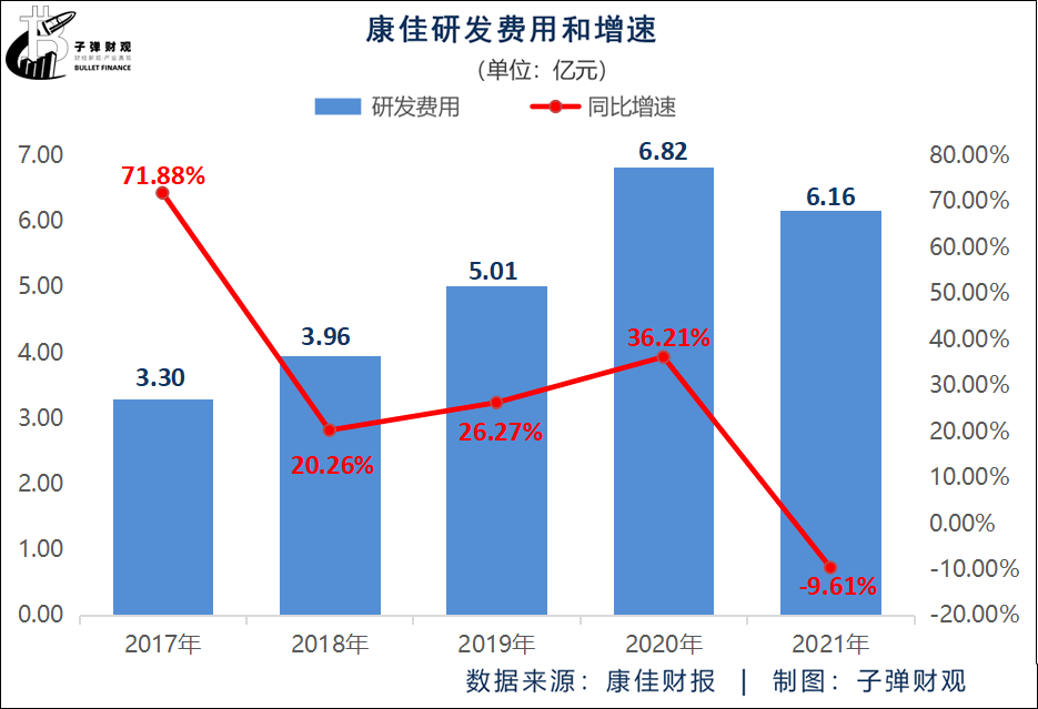 据康佳此前发布的财报显示,在过去的5个年度里,该公司的研发费用已由2017年的3.30亿元增至2021年的6.16亿元。